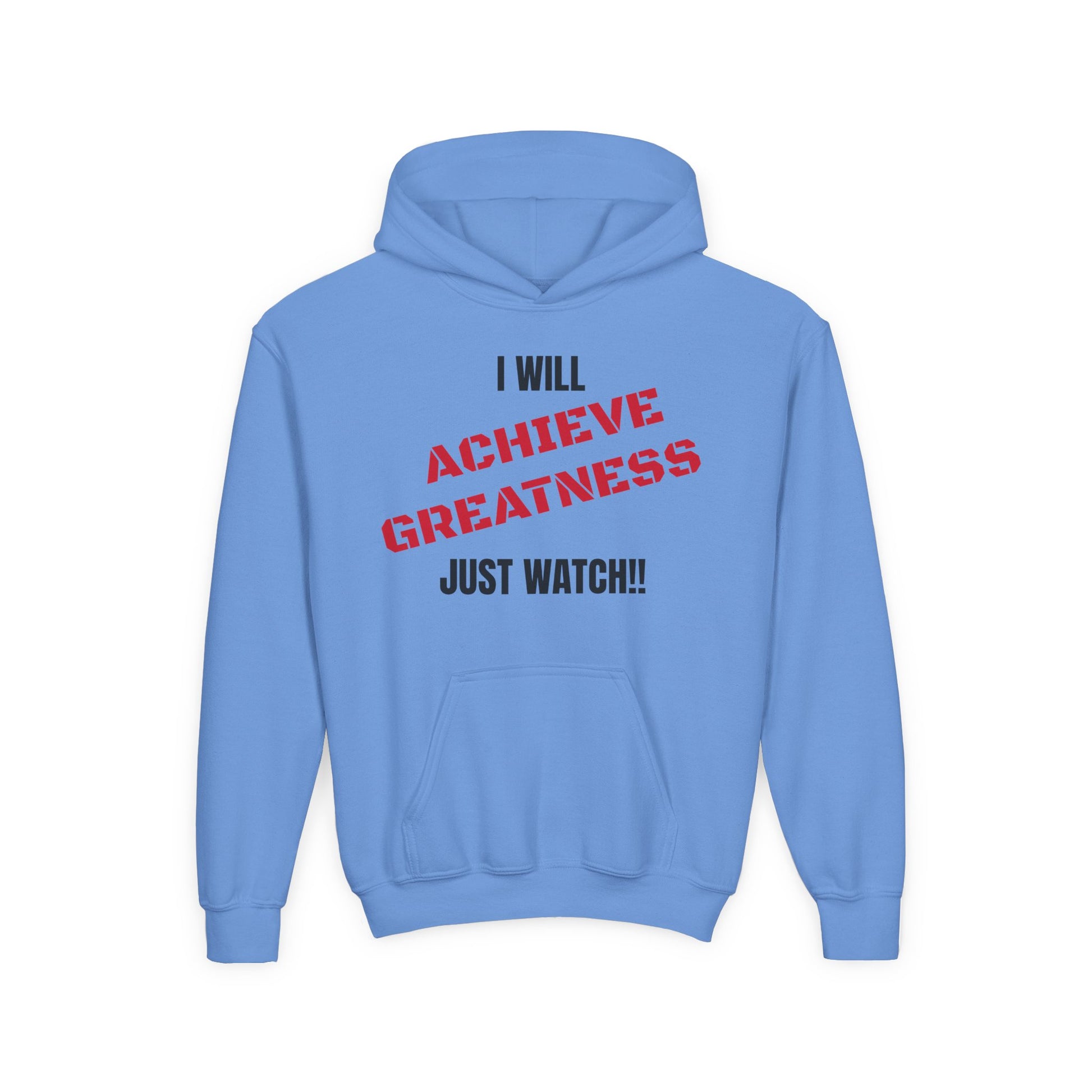 Youth Hoodie — "I Will Achieve Greatness Just Watch!!" Colorful Affirmation Sweatshirt